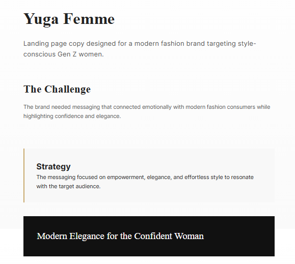 Examples of conversion-focused copywriting including case studies, landing pages, headlines, and product copy.